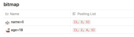 比如现在需要查询 name=li and age=18 的数据,这时我们需要通过这两个字段将各自的结果 Posting List 取出。